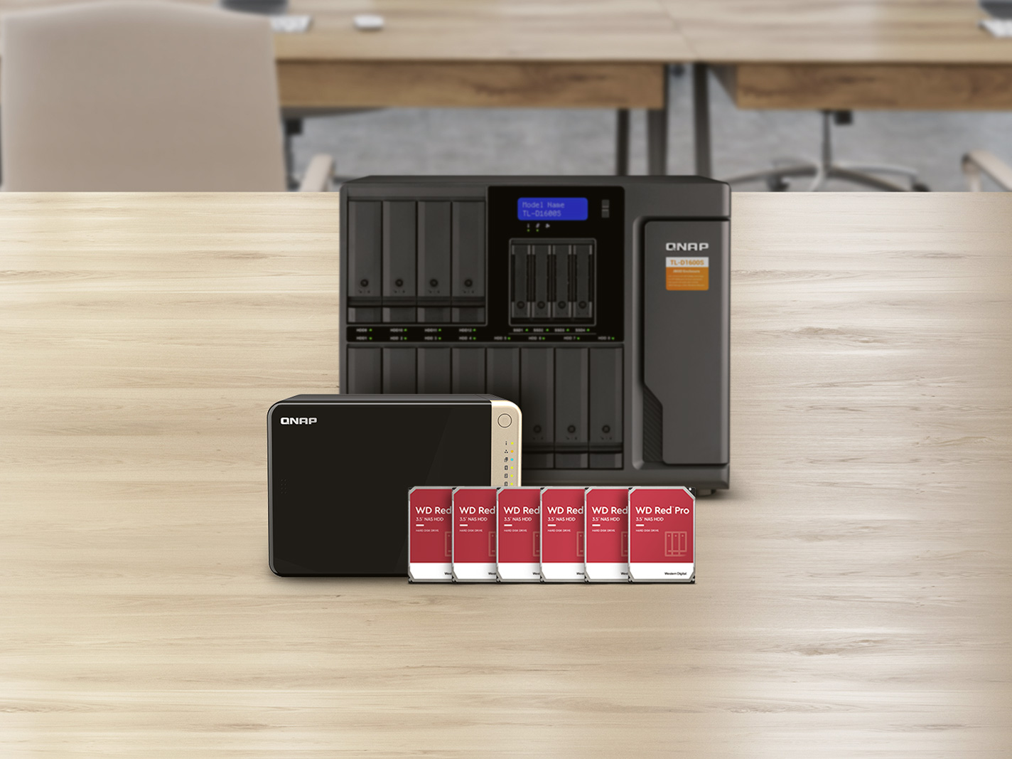 安裝 6 顆 3.5 吋 22 TB 硬碟並建立 RAID 5 組態,及 2 顆 2 TB M.2 SSD。硬碟皆須額外購買。