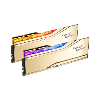 Trident Z5 Royal Neo 皇家戟 EXPO 版 DDR5 記憶體為芝奇專為 AMD AM5 平台所打造的極速效能系列,並以極高標準時尚奢華工藝帶入硬體產品設計的旗艦力作,其散熱片經過精工細膩的電鍍處理,擁有如水鏡般清澈透亮的超高質感光澤,搭配如水鑽般晶亮璀璨的導光設計,採用高品質嚴選顆粒打造高效能模組,提供經典金銀雙色套裝選擇,象徵芝奇皇家戟系列對極限速度與極致美學的永恆堅持。