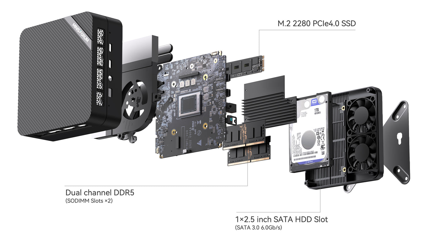 通過簡單的操作即可訪問內部部件以升級SO-DIMM記憶體或 M.2 PCIe SSD,UM690S 提供兩個支持DDR5雙通道的SODIMM插槽,以及NVMe PCIe4.0 的 M.2 2280 PCIe SSD插槽。用戶可以根據使用需求升級 RAM 和硬碟驅動器以獲得更高的數據傳輸速度和更好的數據處理。
